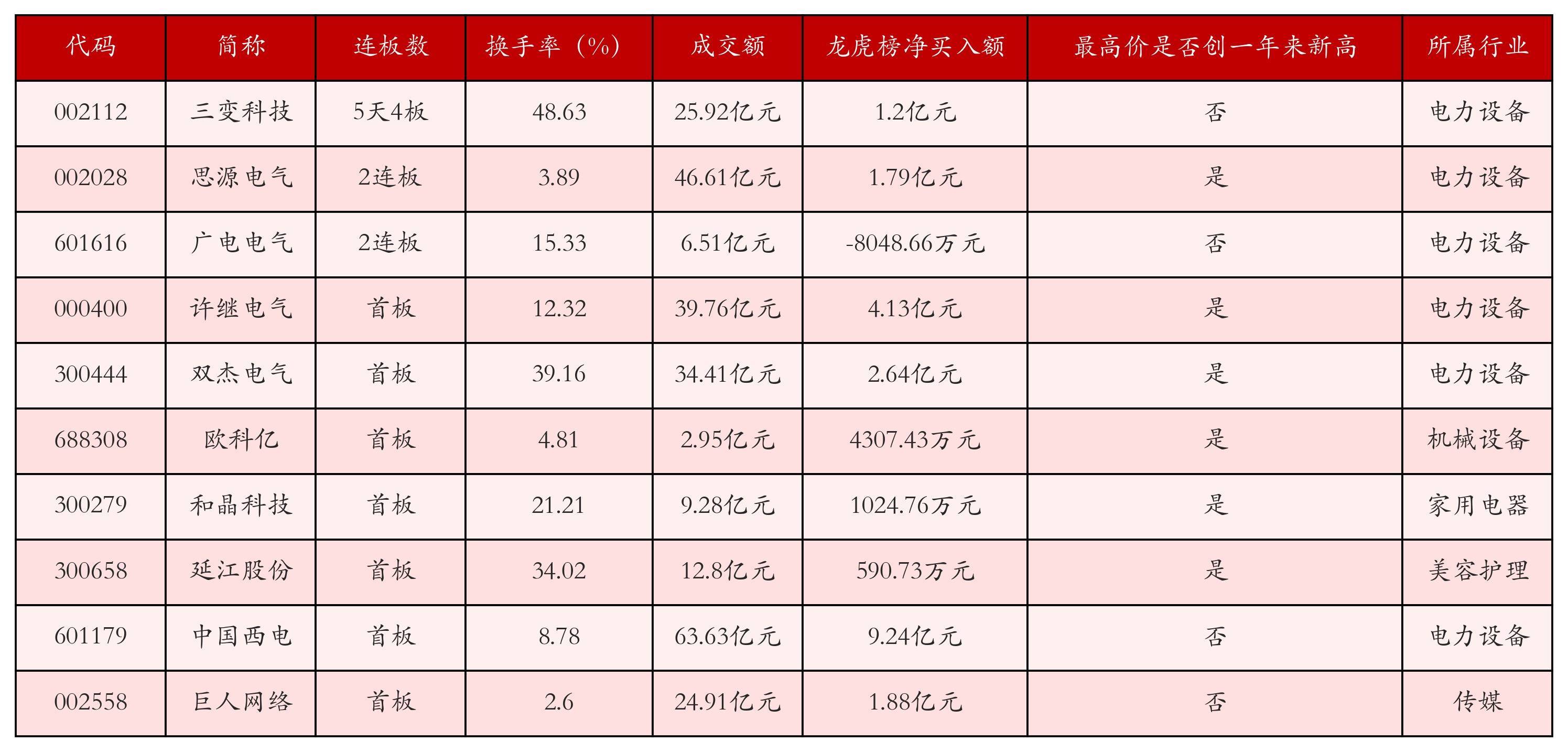 规定1月19日收盘,上证综指上升0.29%,收于4114.0点,深证成指上升0.09%,收于14294.05点,创业板指下落0.7%,收于3337.61点。本日沪深两市A股觉得103只涨停,详细现时连板数以及当日龙虎榜数据,其中较为强势的前三只个股分袂为:三变科技(002112)、想源电气(002028)与广电电气(601616)。本日强势个股前10位具体数据见下表: