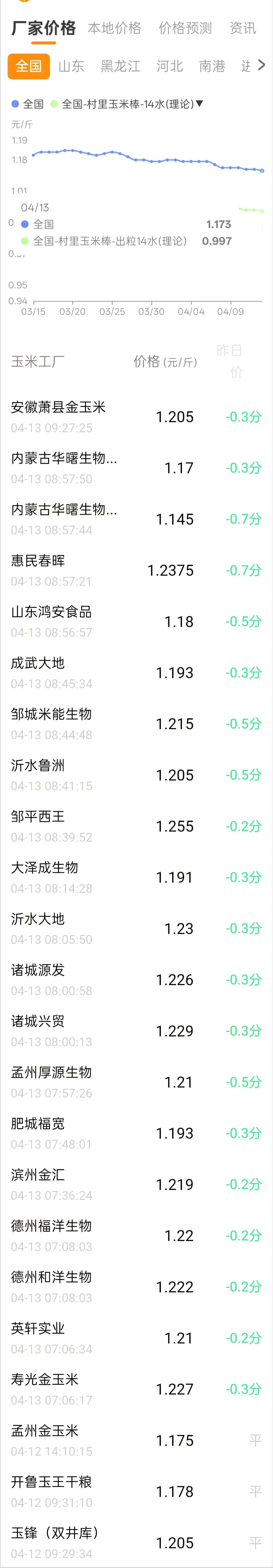 山东沂水地面着落0.3分,1.23元;诸城源发着落0.3分,1.226元;诸城兴贸着落0.3分,1.229元;孟州厚源生物着落0.5分,1.21元;肥城福宽着落0.3分,1.193元;滨州金汇着落0.2分,1.219元;德州福洋生物着落0.2分,1.22元;德州和洋生物着落0.2分,1.222元;英轩实业着落0.2分,1.21元;寿光金玉米着落0.3分,1.227元/斤!