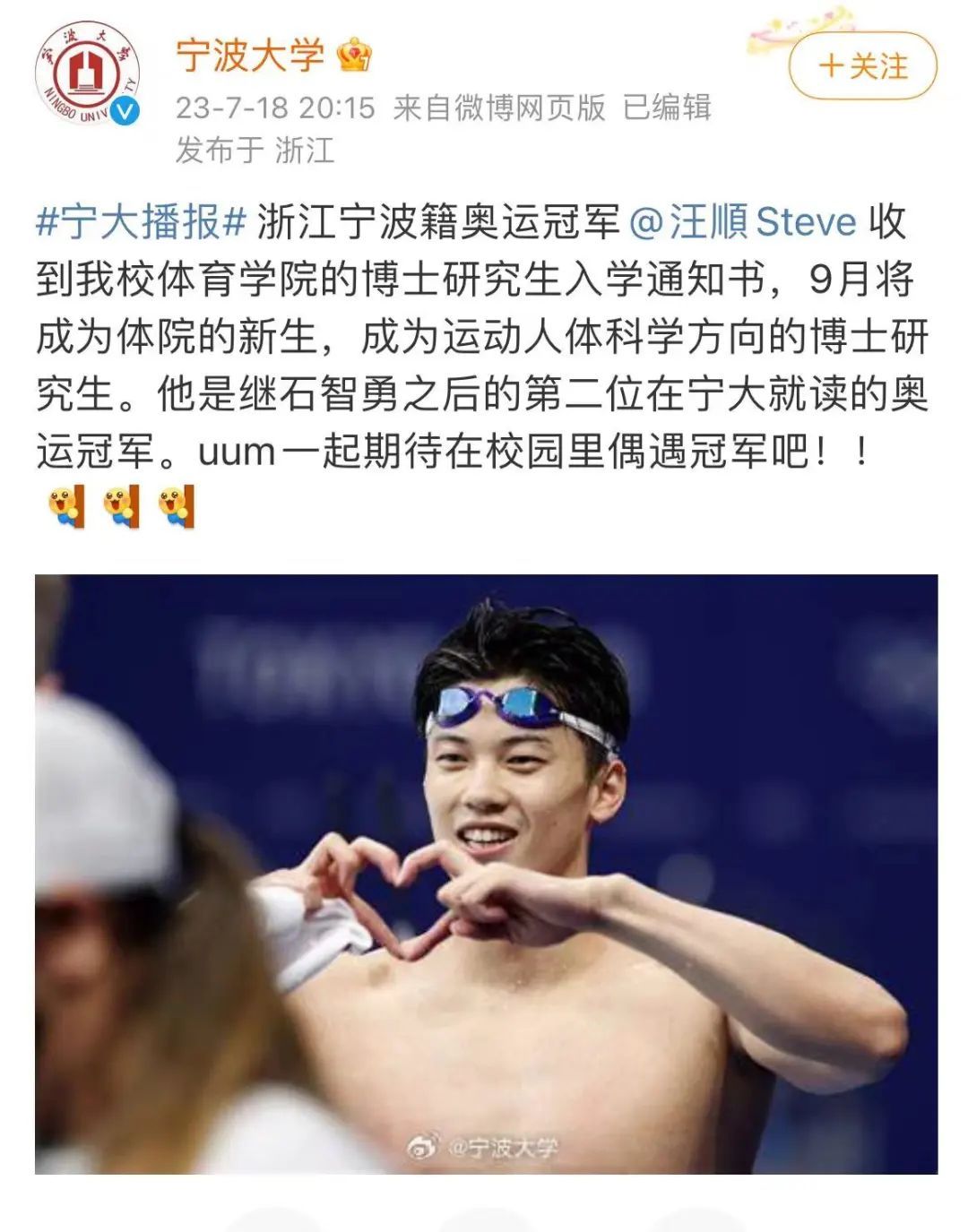 昨年7月18日,宁波大学发文,浙江宁波籍奥运冠军汪顺,收到该校体育学院的入学示知书,成为畅通东谈主体科学标的的博士研究生。