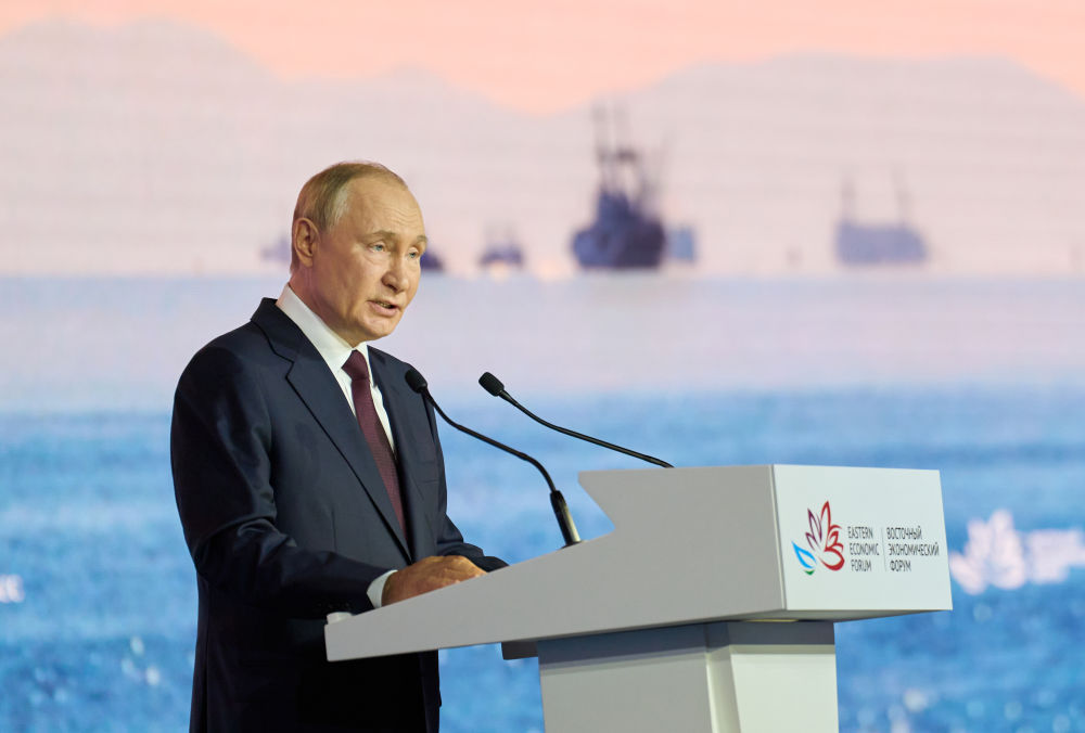 9月5日,俄罗斯总统普京在符拉迪沃斯托克出席第十届东方经济论坛合座会议时发表说话。新华社发(郭飞洲摄)