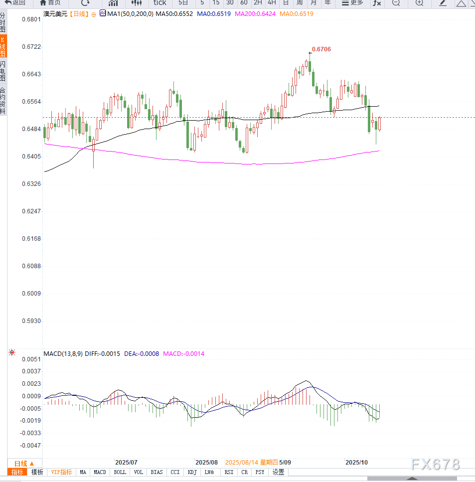 时刻图形透露,澳元兑好意思元仍驱动于下落通谈中,全体趋势偏空。14日RSI位于50以下,标明市集情愫仍然严慎。短线复旧位在0.6450隔邻,若跌破该位,可能测试8月低点0.6414与5月低点0.6372。